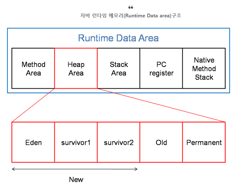 - 이 영역은 크게 Method Area, Heap Area, Stack Area, PC Register, Native Method Stack으로 구성되어 있다.