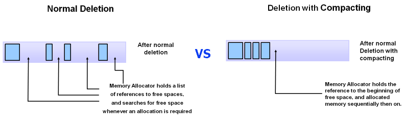 Mark-Compact collection method 란, 새로운 메모리 할당을 빠르게 하기 위해서 기존의 메모리에 있던 오브젝트들을 힙의 시작위치로 옮겨 놓는 방법이다. 창고에서 필요없는 물건들을 버린 후, 창고에 물건을 차곡차곡 쌓기위해창고안을 정리하는 것이라 생각할 수 있다. 아래 그림을 참고하면 이해가 쉽다.