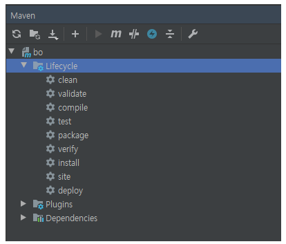 - 메이븐은 프레임워크이기 때문에 동작방식이 정해져있고, 미리 정의하고 있는 빌드 순서가 있다. 이를 라이프사이클(LifeCycle)이라 한다.