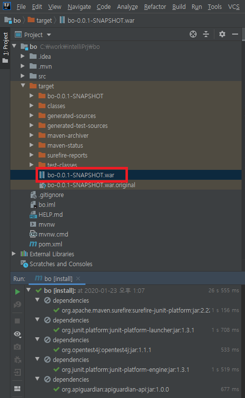 artifactid-version.packaging. 위 예의 경우 빌드할 경우 bo-0.0.1-SNAPSHOT.war 파일이 생성된다. (하단 예시 파일 참고)