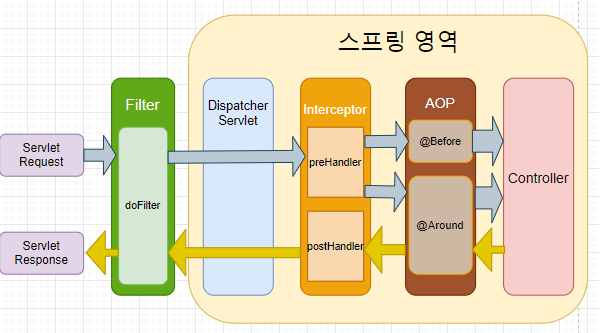 요청 패킷의 실행 순서를 보면 Filter -> Interceptor -> AOP ->Interceptor -> Filter 순입니다.