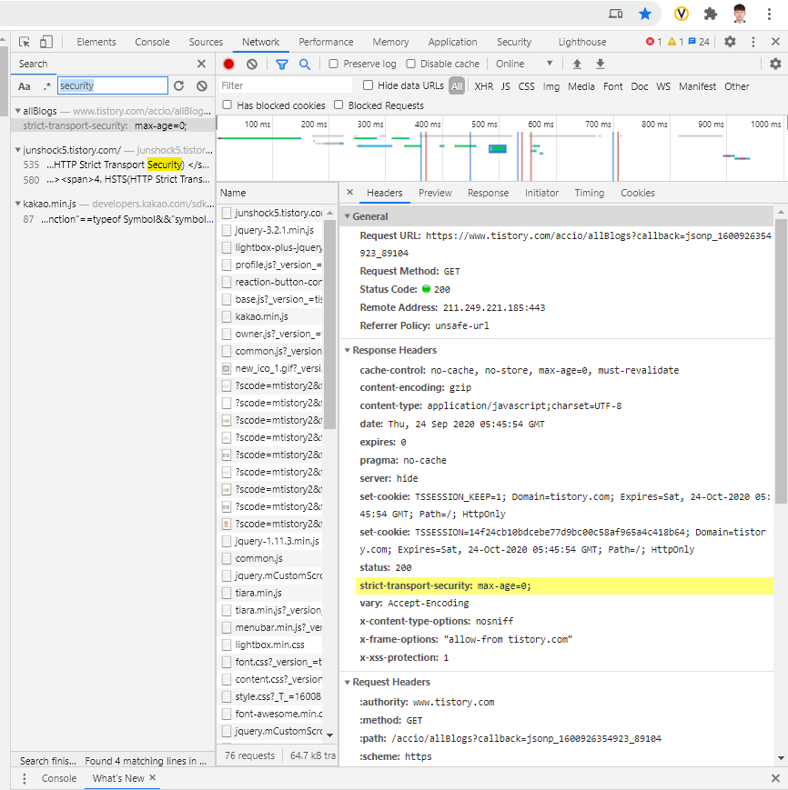 HSTS(HTTP Strict Transport Security) 보안 기능목록을로드해서확인한다.