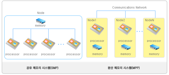MPP(분산 메모리 시스템)은 동시에 많은 프로세스가 각각 CPU 프로세스 메모리 내에 존재하며, 다른 대기 중인 프로세스가 있을 때 미리 할당된 CPU를 사용하도록 한다. (Connection Pool)과 동일. (다만 미리 할당된 노드 개수가 모두 사용 중이면 병목(정책에 따라 대기 상황 또는 새로 connection 생성 비용)이 발생한다.)