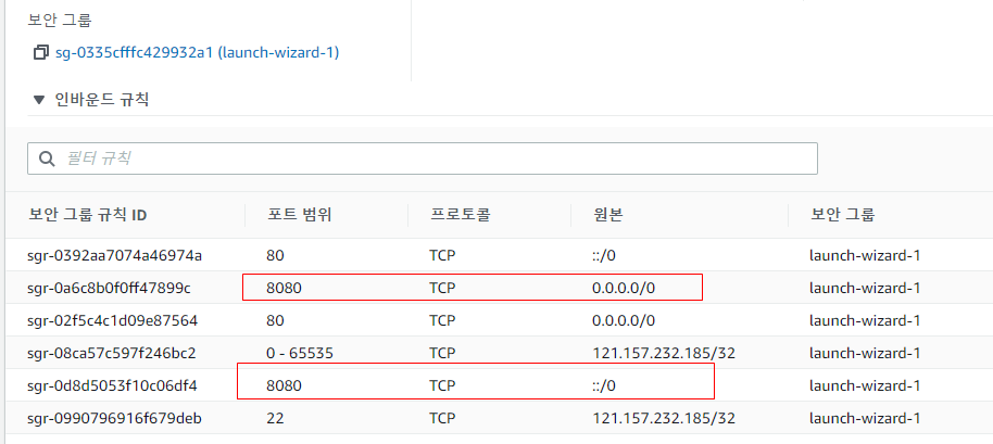 port 8080을 보안그룹 인바운드 규칙에 추가하였다.