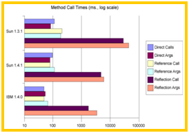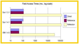 아래는 Dennis Sosnoski(5. Java Programming dynamics, Part 2: Introducing reflection)가 측정한 Reflection에 관한 성능 결과이다. 그림에서 알 수 있듯이, Reflection을 사용할 경우, 직접(Direct) 또는 참조(Reference)의 경우에 비해 2 ~ 4배 정도 느리다.