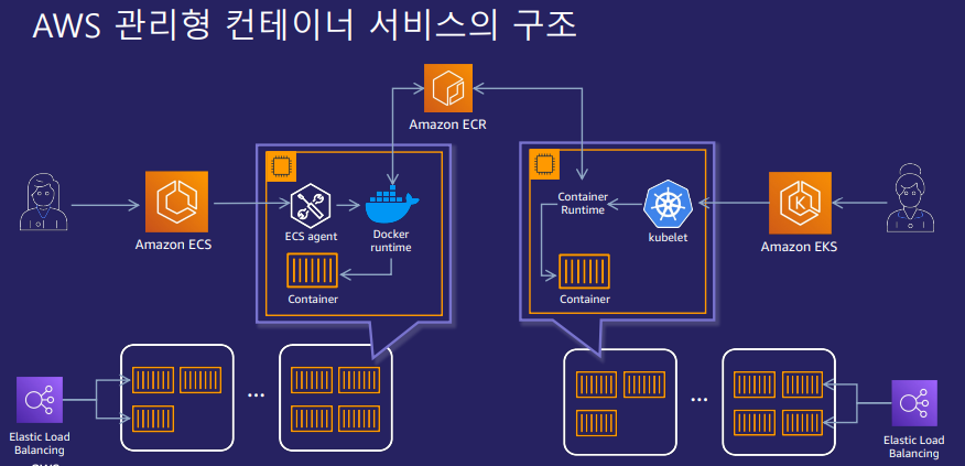 - 그리하여 나온 개념이 컨테이너 오케스트레이션 이다. aws에선 대표적으로 ecs, eks 서비스가 있다.